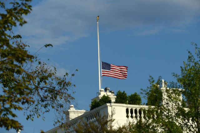 The U.S. flag is shown lowered to half-staff at the White House. (Photo by Olivier Douliery-Pool/Getty Images)