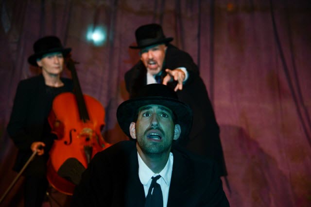 The music comes in the form of a haunting, minimalist score constantly being played under the action, which contributes to the bizarre unease that permeates the play. Cellist Yvonne Caruthers is seated prominently onstage, and accompanies the action with an alienating and evocative series of disjointed notes that seem to come from previously undiscovered parts of the instrument. The actors do occasionally deliver lines in a singsong, but the whole thing is about as far from Rodgers & Hammerstein as you can possibly get, transitioning in turns from a sprightly traditional klezmer sound to a haunting atmospheric melody that seems to rustle across the stage.