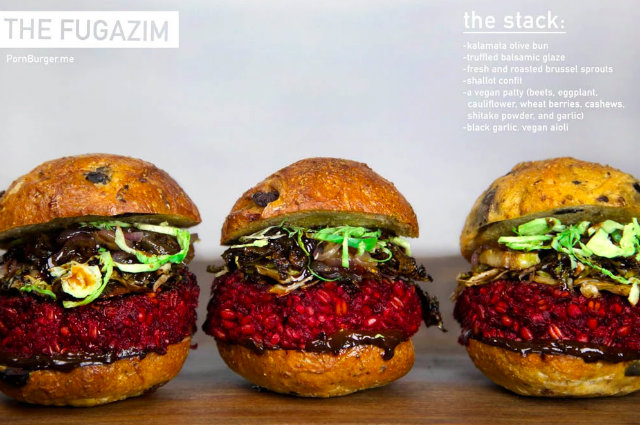 Though a banh mi-inspired burger with a beef patty, chicken liver mousse, pickled daikon and carrot, and cilantro aioli certainly sounds great, there’s a big problem: MacKaye is a noted vegan and this burger definitely ain’t vegan. Thus, Mathew Ramsey, the culinary mad man behind the popular burger blog Pornburger, took it upon himself to create a vegan burger that would surely be MacKaye-approved.