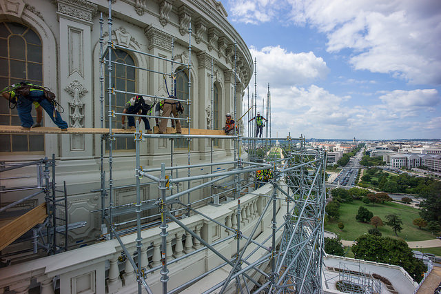 The project, which began last fall, is now in the scaffolding and restoring phase: “With the completion of the safety netting installation inside the Rotunda, work on the towers and bridge on the West Front continues. The scaffolding assembly on the Dome (currently visible at the Peristyle level) will continue upward and is scheduled to be completed in late 2014. As certain portions of the scaffolding are completed, repairs on the cast iron can begin.”