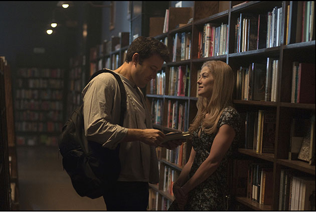 “What are you thinking? How are you feeling? What have we done to each other?” David Fincher’s adaptation of the best-selling novel by Gillian Flynn (who adapted her book for the screenplay) opens with the head of Amy Dunne (Rosamund Pike) leaning back in a Hitchockian close-up of blondeness caressed by her husband Nick (Ben Affleck). It’s an intimate moment, but one fraught with tension. Nick narrates his story over this image, and his notion to unspool his wife’s brain suggests the depths of his violence, or so we are led to believe. But this isn’t simply a tale of domestic violence and murder. The movie is a bleak if superficial story of a marriage gone bad, and a movie about storytelling — the stories we tell ourselves and the stories we believe.