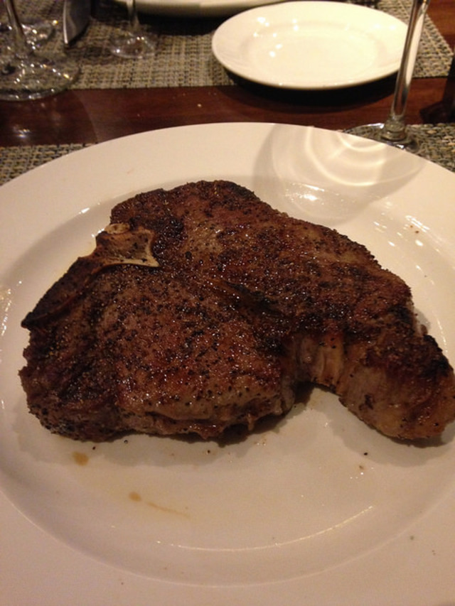 The 12-, 16- and 20-plus ounce prime chops, which sell for around $40 to $60, seem to punch above their weight grade. This steakhouse uses wet-aging—no drying beef sides hanging in the window here—so the cuts retain their moisture and don’t develop that depth of flavor that can come from dry-aging. My porterhouse was prepared to a perfectly cooked chef’s choice medium rare, with some red on the strip side and the filet portion melting apart with the touch of my knife. The kitchen could take it a little bit easier with the salt shaker; I enjoyed the chop much more after scraping my knife over its top to run off some of the seasoning. Less would be more, especially when followed by bites of the bacon-laden steakhouse sides. Shaved Brussels sprouts are a stand out.