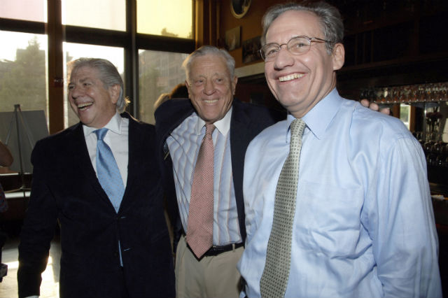Ben Bradlee, center, with Carl Bernstein, left, and Bob Woodward, right, in 2005. (Photo by Brad Barket/Getty Images)