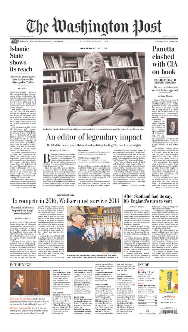 Ben Bradlee, the legendary Washington Post editor who died at age 93 yesterday, is the focus of the front page of the paper he once led today.