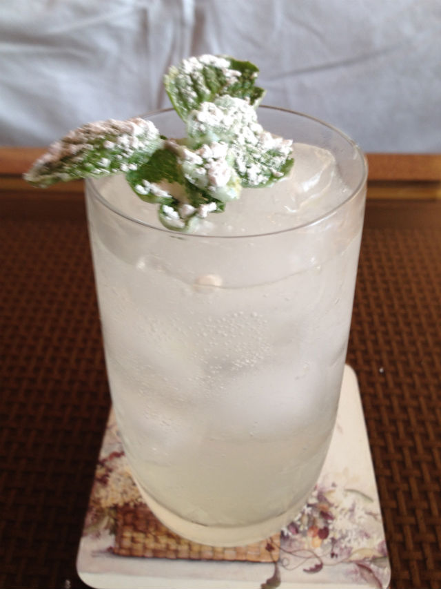 Mix all ingredients except lime, club soda and mint in a shaker. Pour over fresh ice in a Collins glass. Fill with club soda and squeeze in juice of half a lime. Garnish with a wet mint sprig dusted with powdered sugar.