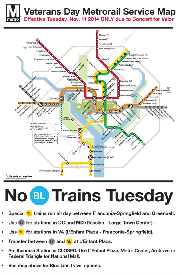 In order to accommodate people going to the concert, Metro recently announced that they’re suspending Blue Line service that day, instead beefing up Yellow Line service. “In order to provide the fastest, most direct trip for the greatest number of riders—and to provide longer, more frequent trains—Metro will replace Blue Line trains with additional Yellow Line trains on Veterans Day,” it said in a release. “A Yellow Line train will get Virginia riders to the concert 12 minutes faster than a Blue Line train. This, in turn, means that Metro can run trains more frequently and maximize space for other riders. Yellow trains will run as frequently as every 3 minutes before and after the event.”