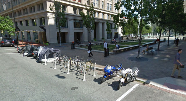 A tipster who works in the area sent DCist the above photo, which shows the space previously occupied by bike racks being used for motorcycle parking. A spokesperson for the District Department of Transportation said the racks were removed at the request of a member of the Penn Quarter Neighborhood Association, who said it was “blocking a historic viewshed.”
