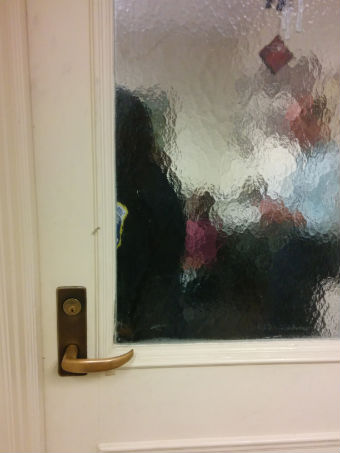 A guard blocks the door of Bowser’s office. Photo by Sarah Anne Hughes.Five people, some residents of Mount Vernon Plaza, others affiliated with ONE DC, were eventually allowed to enter the office to explain to Joy Holland and Robert Hawkins, Bowser’s chief of staff and legislative director, respectively, their demand: A written comment from Bowser on the People’s Platform, which includes a call to freeze rents at places like Mount Vernon Plaza, one apartment building where local and federal affordability requirements are soon set to expire. Residents of Mount Vernon Plaza say they were not told a Low Income Housing Tax Credit was set to expire at the end of 2013, increasing their rents by hundreds of dollars.