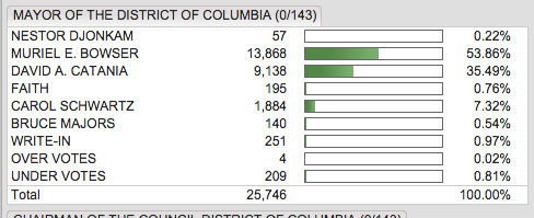 With nine precincts in — for a total of 6,102 votes — Bowser still has 54 percent of the vote to Catania’s 35 percent.