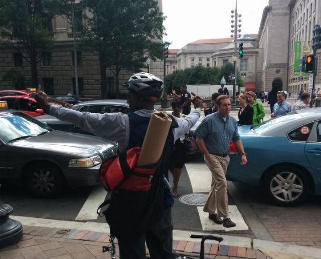 A cyclist expresses his frustration with cab drivers blocking streets as they protest regulations. Photo by Sarah Anne Hughes