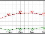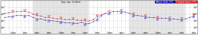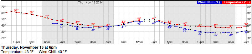 As the below graph from the National Weather Service shows, a low of 36 degrees Fahrenheit is predicted for this evening. Morning commuters on Thursday can expect temperatures in the low 40s.