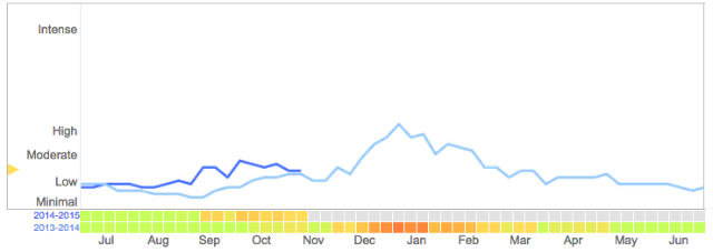Thus far, flu activity in D.C. is sporadic, according to the Centers for Disease Control, and low, according to Google trends. Since September 28, just 3.6 percent of cases tested and reported to the CDC in Region 3 — which also includes Delaware, Maryland, Pennsylvania, Virginia and West Virginia — tested positive for influenza. Flu season usually peaks between December and February.