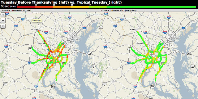 Tuesday’s traffic awfulness was followed by Wednesday afternoon and Monday evening. MWCOG also released a series of interactive maps to show when and where Thanksgiving traffic is worst in the area.