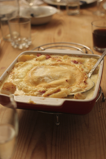 The dish itself may not have much history, but the cheese it calls for certainly does. Reblochon’s name comes from a Savoyard word meaning “to remilk,” which has its roots in a 14th century tax evasion scheme. At that time, taxes were collected from local farmers based on the amount of milk their cattle produced. The peasants would partially milk their cows, wait until the inspectors had left, then “remilk” their cows. The much richer milk from this second milking would be used to make Reblochon.