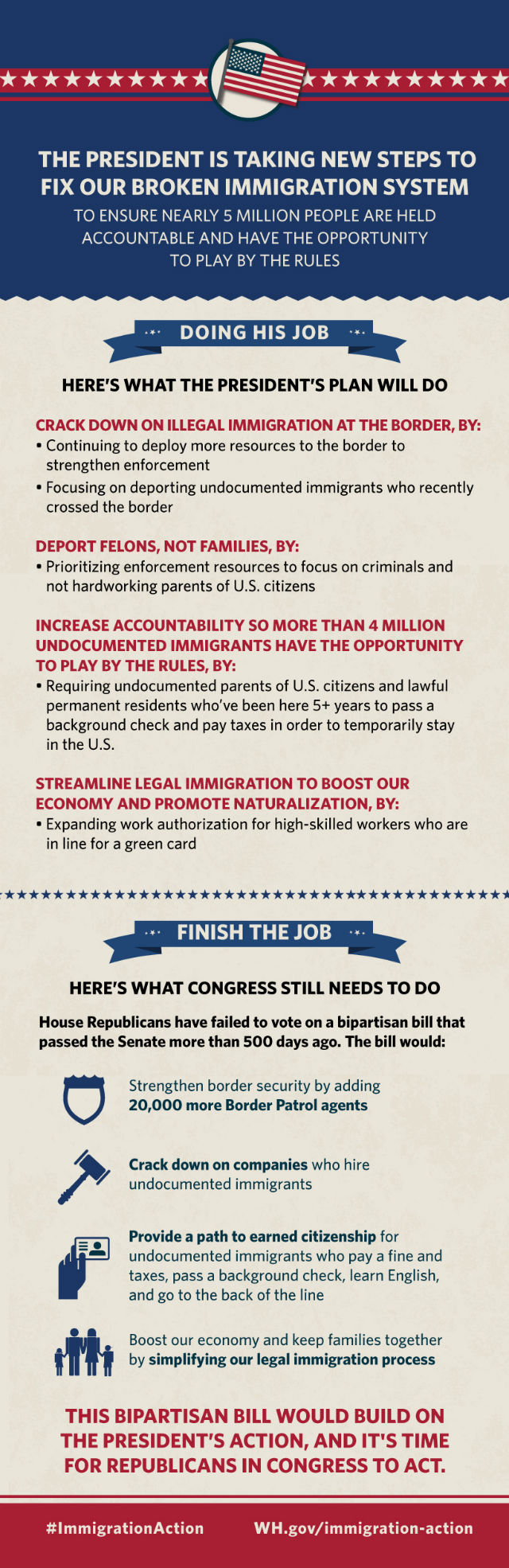 “Even as we focus on deporting criminals, the fact is, millions of immigrants — in every state, of every race and nationality — will still live here illegally. And let’s be honest — tracking down, rounding up, and deporting millions of people isn’t realistic,” Obama said. “Anyone who suggests otherwise isn’t being straight with you. It’s also not who we are as Americans. After all, most of these immigrants have been here a long time. They work hard, often in tough, low-paying jobs. They support their families. They worship at our churches. Many of their kids are American-born or spent most of their lives here, and their hopes, dreams, and patriotism are just like ours.