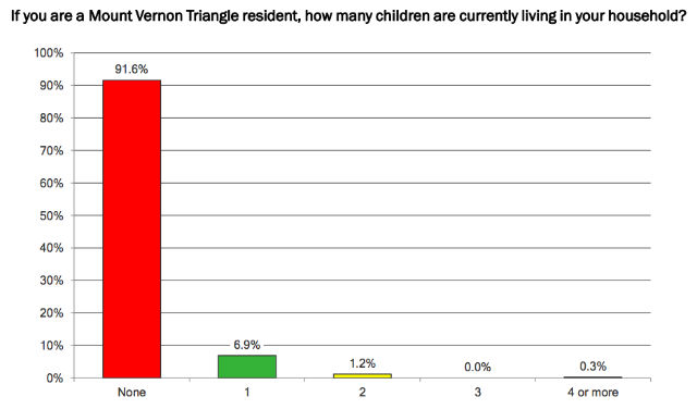 A survey of residents who live in the Mount Vernon Triangle neighborhood found that they are overwhelmingly childless and would leave the area to grow a family or find a less expensive place.