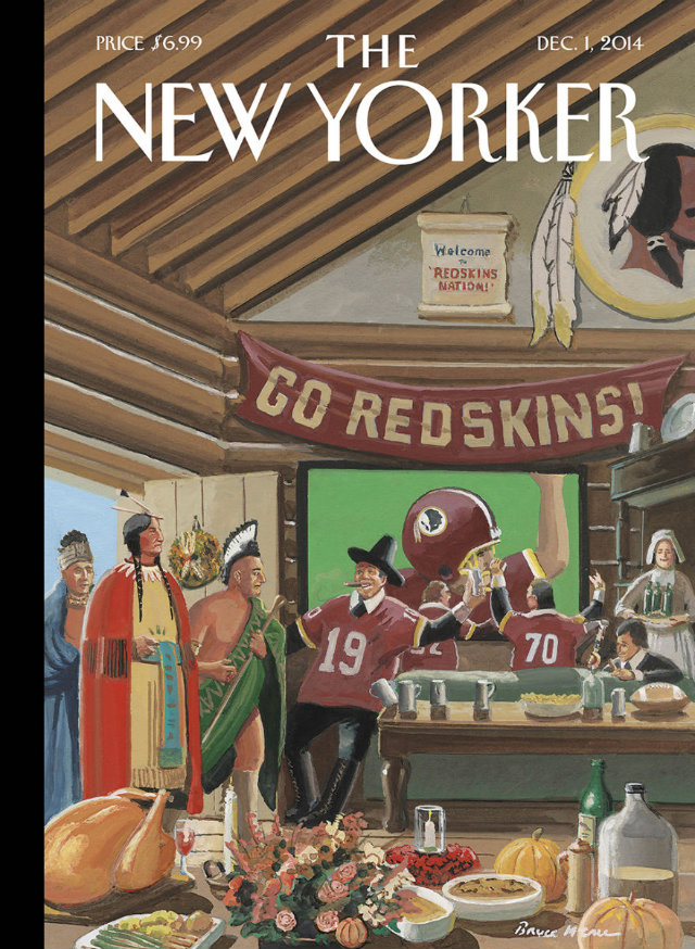The cover, which was designed by artist Bruce McCall, features a modern day Thanksgiving dinner, with disappointed-looking Native Americans feasting with jovial, arrogant-looking pilgrims clade in Washington football team gear watching a game. Here’s what McCall says about it: