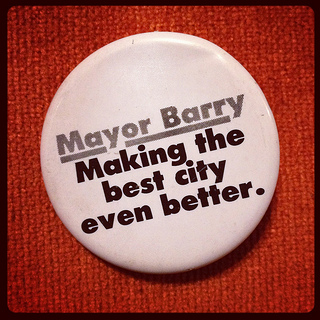 A Barry campaign pin from the 1980s. Photo by allison_dc.Barry was first elected to D.C.’s highest office in 1978 then again in 1982 and 1986. “I said, ‘We need to ‘Take a Stand’ for new leadership and show that we are not going to take the same old, same old of do-nothing Washington politics,” he wrote of his first campaign in a 2014 autobiography. “You had to do something to make changes; you couldn’t sit around expecting the best to happen. Nothing would change that way.”