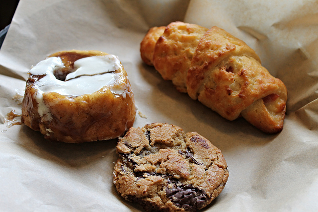 A gooey, frosted cinnamon roll gave me a similar sensation. The dough is a little thicker than that which would make up a regular roll. You can sort of pull it apart if not unspool it like a ball of yarn. A pleasant bite and sweet taste is there. If you can regularly eat gluten and remember what pastry is, you’ll know what you’re eating is something different, but you won’t be upset about it. The berry Danish even more approaches regular texture. No one would notice the chocolate chip cookies are gluten-free. They’re rich in chocolate, slightly crispy and slightly chewy.