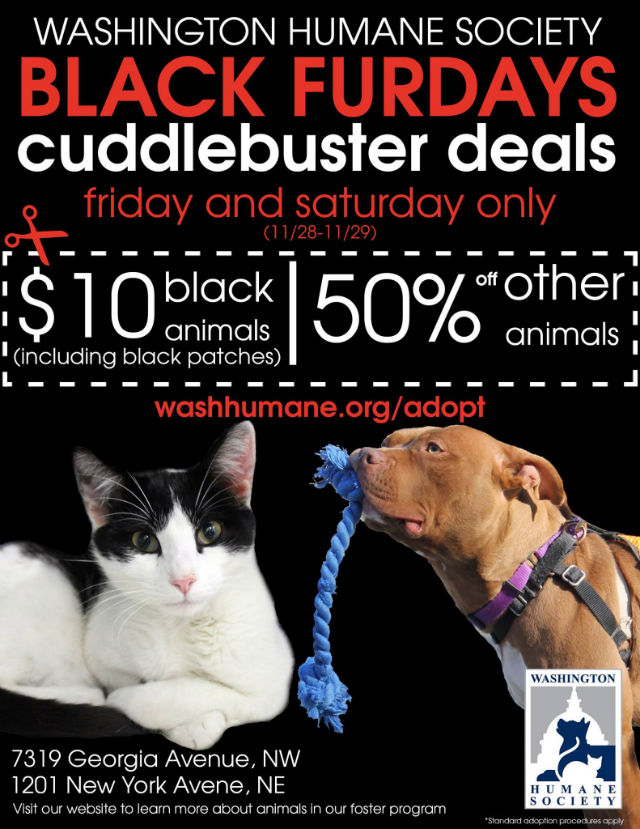 In a non-evil use of Black Friday, the Washington Humane Society is offering $10 adoptions on all animals that have any black fur. That could mean a full, dark coat or a single coal-colored spot.