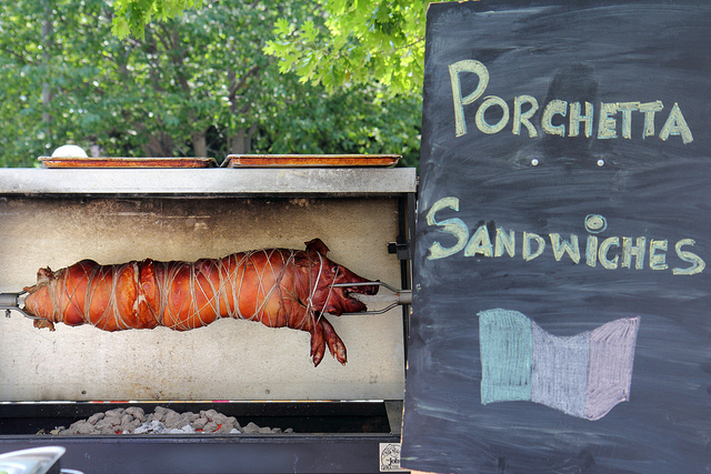 What does it taste like: Any way you slice it, porchetta should taste juicy, salt-tinged, and maybe even a little unctuous from the fat. It can be served warm (often as a roast) or cold (typically thin-sliced on a sandwich). Seasonings may vary according to the chef’s fancy, but garlic, herbs, orange, and chili is a popular combination.