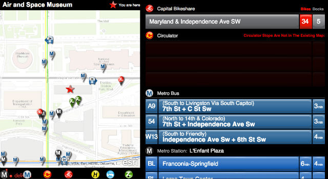 Metro Bus / DC Circulator schedules and Nextbus updates Metrorail arrival predictions Capital Bikeshare bike and open dock availability Caresharing location and car availability The custom dashboard [is] expected to be [displayed] on a monitor near the exit of the retail establishment or somewhere easily accessible to visitors of the establishments, offering the clients near real-time transportation options for their next destination.