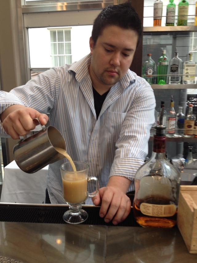 The winter bar at Poste Modern Brasserie (555 8th Street NW) is open Thursday through Saturday with a fire pit for roasting s’mores, hot drinks and area heaters to keep guests warm. Head bartender James Nelson has put a new spin on three old favorites: a hot cider drink, the hot toddy, and the Mexican cocoa. “I knew I wanted to do a salted caramel cider, and I played around with Calvados for the liquor before I settled on dark rum,” Nelson says of his Appleton of My Eye. He starts the drink with a boiling pot of heavy cream, brown sugar and salted cider, and completes it with Appleton VX rum and a caramel coated apple slice. “They’re very popular,” says Nelson. “Last Saturday we sold about eighty of them. We had to start batching them to have enough.”