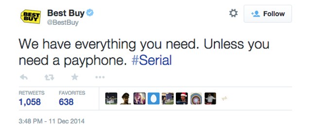 The mysterious pay phone has been a hot topic amongst fans, and Best Buy apparently saw it as a branding opportunity, tweeting this afternoon: “We have everything you need. Unless you need a payphone. #Serial”