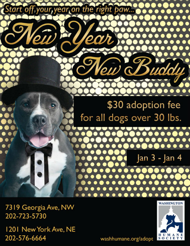 The adoption fee for dogs over 30 pounds will be reduced from $170 to $30 on January 3 and 4. While the fee is discounted, the adoption process is the same, and D.C. adopters must purchase a $15 dog license.