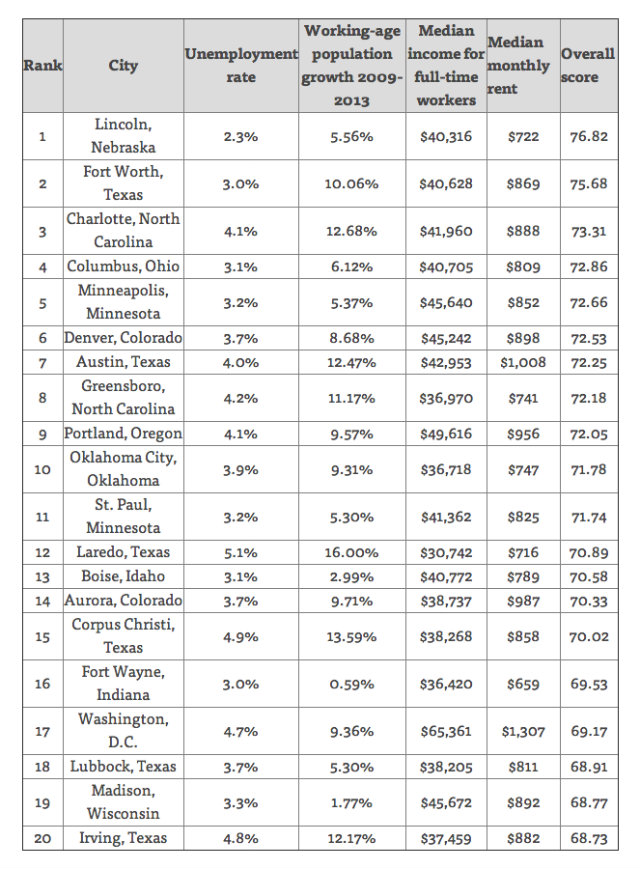 What likely tipped D.C. over the edge and into the final line-up was the unemployment rate. Nation-wide, it’s about 6 percent, but it’s at 4.7 percent in the District. And working-age population growth probably didn’t hurt—9.36 percent between the years 2009 and 2013.