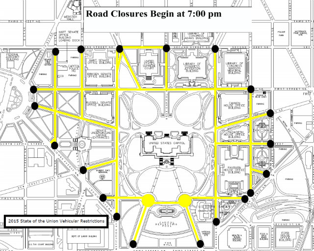As President Barack Obama prepares to give another State of the Union address tonight (will he give D.C. statehood a shoutout? Who knows!), the U.S. Capitol Police prepares street closures to accommodate the President’s motorcade. Here are the street closures you should be aware of, via the Capitol Police: