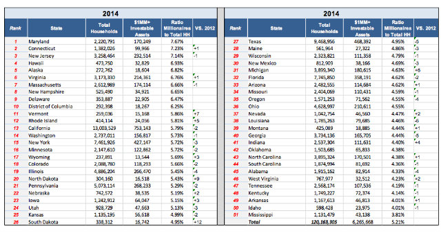 Phoenix Marketing compares total households to those with over $1 million in assets — that ratio then becomes the defining stat. Thus, in Maryland, millionaires make up 7.67 percent of the population. And (again, no surprise here) all areas comprising the D.C. area are actually represented in the top 10. Virginia ranks at number six with 6.76 percent millionaires (a jump from its place at number seven in 2013), while D.C. has been holding strong at the tenth spot for several years now; this year, its millionaire percentage is 6.25 percent.