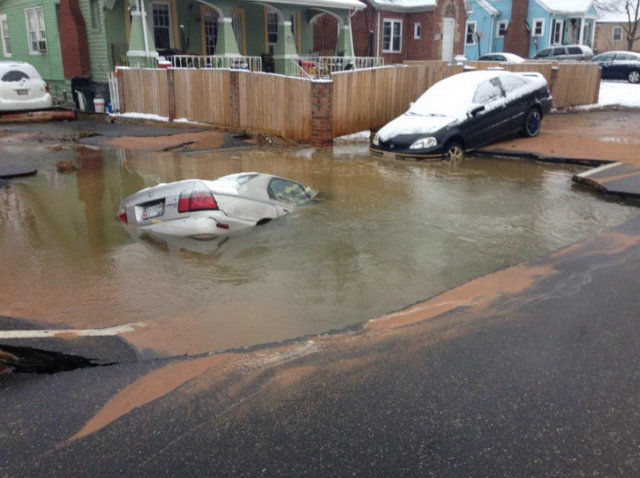 Break on Edmonston RD in Bladensburg caused hole. One car in the hole another on the edge. pic.twitter.com/s0F4yciQDb