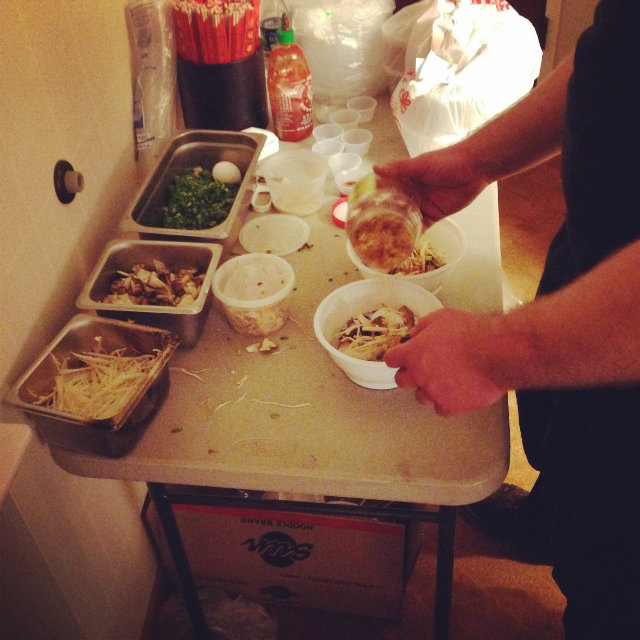 8:30 p.m. We arrive at our hotel room. A few friends who run Milk Cult, a catering business/soon-to-be-restaurant, have turned our hotel room into the kitchen/headquarters for their secret ramen delivery service. The room smells like ramen and is approximately one million degrees (87 degrees). Everyone is sweating.