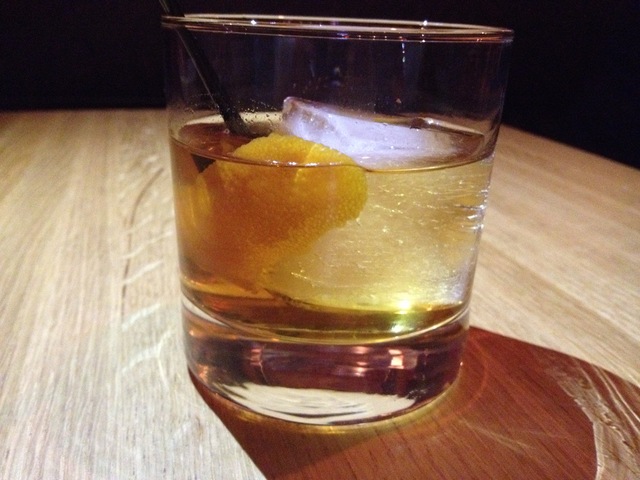 A couple of barreled cocktails that caught my eye with their fusion of southwest and European liquors. The first is the batched EL Lobo at Barrel (613 Pennsylvania Avenue SE). It is made with Montalobos Mescal, Liquor 43, Bonal (a French bitter aperitif) and topped with a dash of cherry bitters. It starts out smoky and rich with mescal flavor, but as the single ice cube melts, it softens to the sweeter taste of an after dinner brandy cordial with hints of dried cherry.