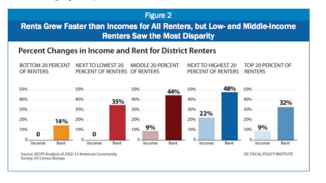 “There is virtually no inexpensive housing left in D.C.’s private market,” says Wes Rivers, Policy Analyst at the DC Fiscal Policy Institute, and author of the report, which is an update from a similar 2012 report. “Without housing assistance, many families have no choice but to devote most of their income for rent.”