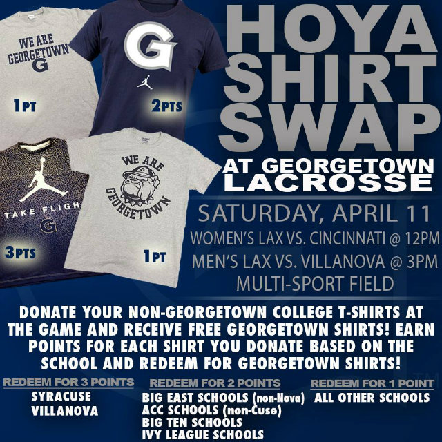 “We see a lot of students walking around campus with shirts from ‘other’ schools,” the Athletic Department writes on its Facebook page, where they are advertising a swap: Hand over your apparel from those ‘other’ places and get brand-new Hoya t-shirts.