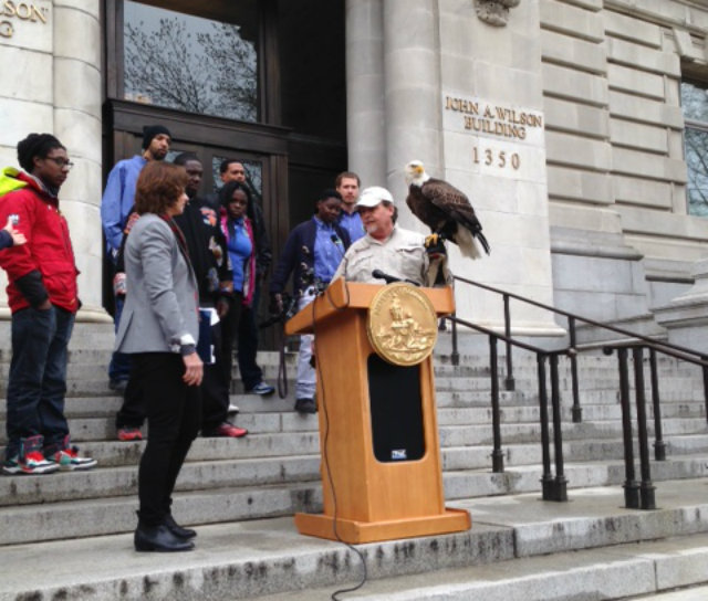 At a press conference today, Councilmember Mary Cheh (D-Ward 3), along with officials from the DDOE, the Earth Conservation Corps—a local environmental action program works with unemployed community to help with Anacostia River restoration—and Challenger, a bald eagle ambassador for his species (yes, that’s his title) officially announced that the bald eagle—the majestic, uber-‘Merican symbol of our nation—has once again made the nation’s capital its home.