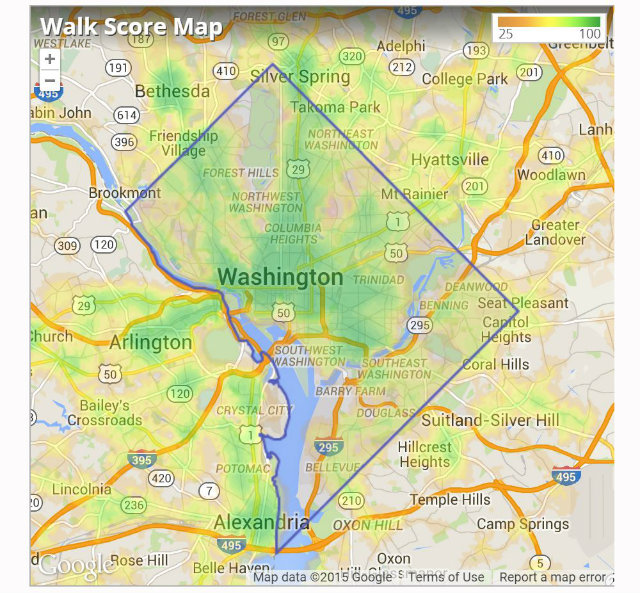 Walk Score ranked D.C. seventh in the country with a score of 74.1, both of which were unchanged from 2014. That means that Washingtonians have, on average, access to eight coffee shops, bars, and restaurants within a five-minute walk of their homes, said Rachel Musiker, a spokesperson for Redfin. But it must be noted that such access is wildly uneven across the city.