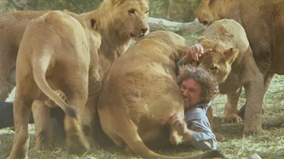 Noel Marshall lived to be 79. (Drafthouse FIlms)Noel Marshall has only one credit as a director, a film financed in part by proceeds made from a little film he produced called The Exorcist. Roar, originally released in 1981, is unlike any other film—thank God! It started as a six-month production slated to cost $3 million, but it took 11 years and another $11 million to finish a movie that some think should have sent the director to prison. The trailer proudly boasts that no animals were harmed making this film—but that 70 members of the cast and crew were harmed. I didn’t actually count the names in the credits, but I reckon they’re about 70. The plot, as it were, turns on wildlife preservationist (Marshall) and his real-life family, then-wife Tippi Hedren, stepdaughter Melanie Griffith, and his sons John and Jerry. Marshall’s family pays him a surprise visit in Africa (though the film was largely shot in a California location that is now the Shambala wildlife sanctuary). The film strikes an odd balance between a gory nature video and an extended Benny Hill sketch in which his entire family runs for their lives. At one point, Marshall was hospitalized for six months; Hedren developed gangrene; Griffith required facial reconstructive surgery after being mauled; both Marshall sons suffered concussions; and cinematographer Jan De Bont (who went on to direct Speed) required 220 stitches after a lion tried to carry him by his scalp. Nobody really has to act here, and they don’t. But Marshall, in his only acting credit, has a strange charisma, like a deranged hippie woodsman set loose in the jungle with gorgeous wildcats as his untrained menagerie. It’s too bad E Street is only scheduling this for midnight screenings; in it’s terrible way, it’s essential filmmaking.