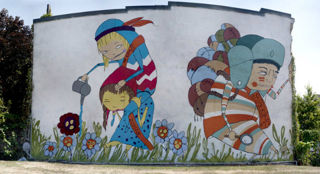 “SHH” AND “TIN CAN TELEPHONE” BY JAMES BULLOUGH AND KARL ADDISON (JBAK): I love the design style of JBAK’s murals. These two colorful murals feature realistic renderings of teens and adults playing in the city. The characters are the stars—full of expression and beautifully rendered—and the bold geometric shapes that fill their outfits (in “Shh”) and intersect their bodies (in “Tin Can Telephone”) add contemporary graphic style to the realism. JBAK currently live and work in Berlin, so we are lucky to have their beautiful work donning our buildings. — Lynne Venart