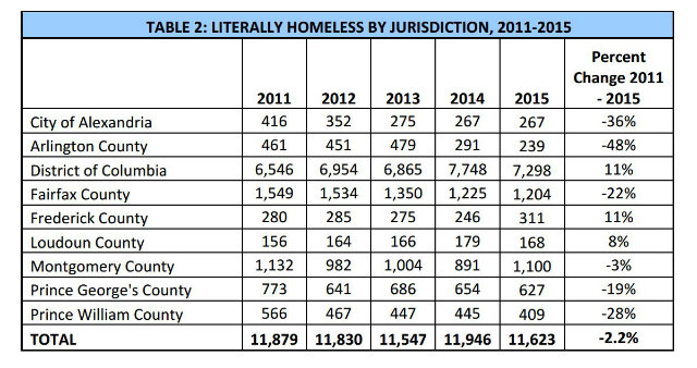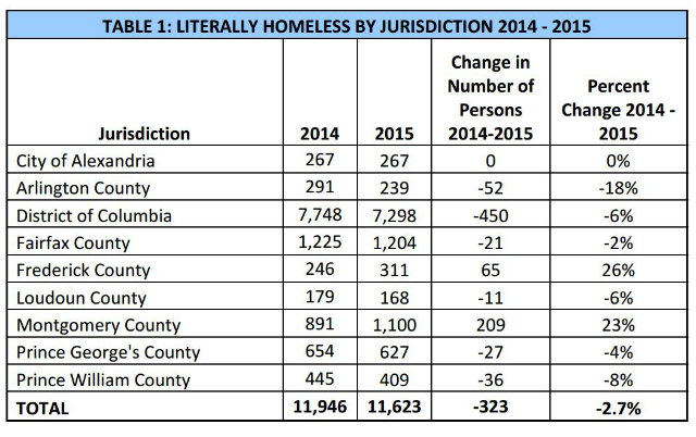 Across the region, homelessness is down 2.7 percent, with Arlington County marking a significant decrease. The report attributed factors like “the region’s increased supply of permanent supportive housing, increased use of rapid re‐housing, and homeless prevention and diversion efforts” for the overall decline. Montgomery and Frederick county, however, each saw increases of more than 20 percent.