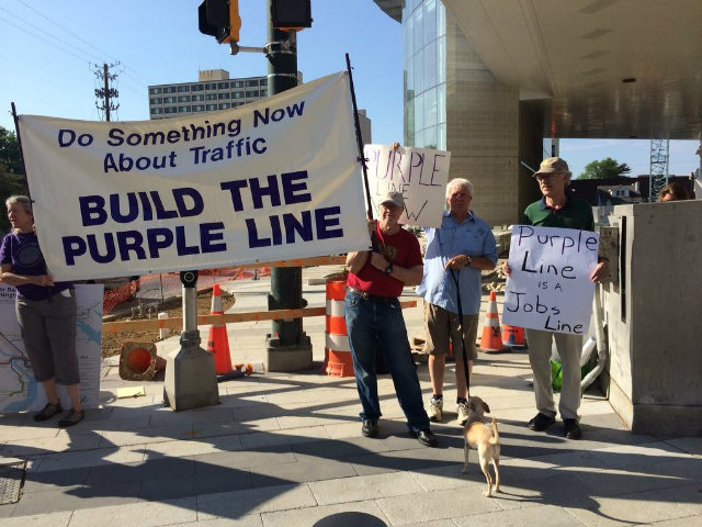Purple Line proponents—angry that Gov. Larry Hogan has delayed making a decision on the long-planned light rail project—protested this morning outside one of the planned stops.