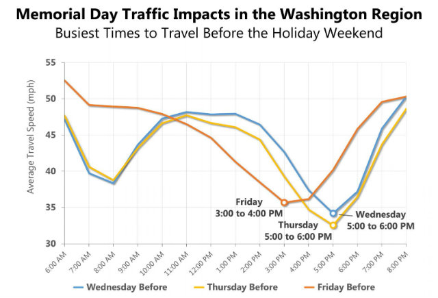 Using “commercially available speed information from the last five years,” the TPB found that the absolute worst of it came on Thursday afternoon between 5:00 and 6:00 p.m. The researchers also confirmed that travel on the Thursday before Memorial Day was worse than the Friday for each of the past five years.