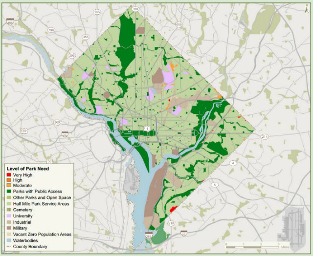 The ParkScore index also showed that 97 percent of Washintonians are within a 10-minute walk of a park, while identifying a few areas that still have a high need for access to green space—most of which are east of the river.