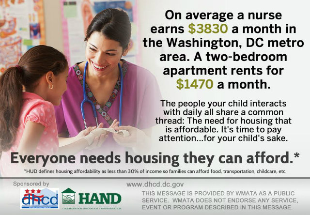 The latest public service announcement to grace the sides of buses and Metro stations comes courtesy of Housing Association of Nonprofit Developers (HAND), in partnership with the Department of Housing and Community Development. It features a nurse kindly bandaging up a child, and points out that the average nurse would have to pay nearly 40 percent of her salary to afford a two-bedroom in D.C.