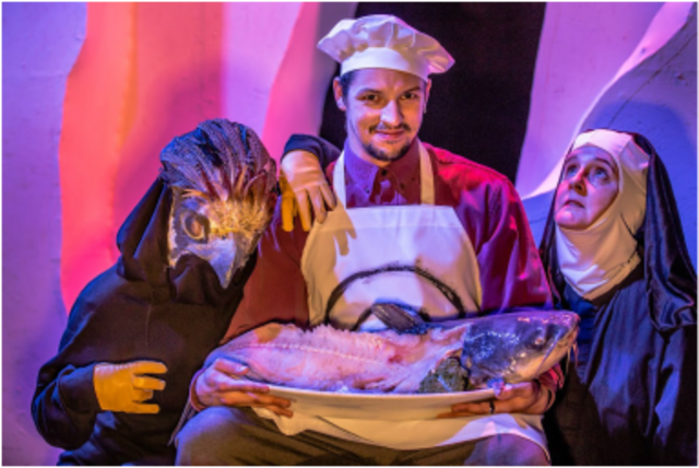 Sellers’ performance is skilled, but more importantly, he commits to every strange scene or nonsensical line. The rest of the cast is equally sincere, and that matters in a work this unusual, and in a production held up by—it must be noted—a shoestring budget. Everyone plays several characters, and there are only so many costumes, so the burden of clarity is almost entirely on the actors. Even in a play not overly concerned with clarity, some scene transitions seem to rely rather lazily on confusion-as-trope to excuse what is simply poor staging, for example.