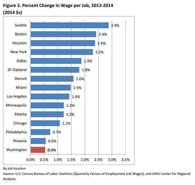 That trend also held true for the region at large, according to a report from the George Mason University Center for Regional Analysis that analyzed data from the U.S. Census Bureau of Labor Statistics. The average wage in 2014 when including D.C., Northern Virginia, and the Maryland suburbs was $69,645, an increase of 0.5 percent from 2013.