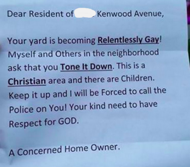 “Thou shalt love thy neighbour as thyself,” one of the Ten Commandments reads. But apparently, one Christian neighbor in Baltimore isn’t intent on following that one. Shortly after Julie Baker decorated her home on Kentwood Avenue with rainbow-colored jars to hold lights on her porch, she found this homophobic and not-so-subtle note on her door: