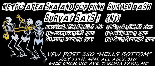 Saturday’s soiree is sure to be a good time with Backyard Superheroes, Survay Says!, Thirteen Towers, The Captivators, Six Foot Machine, The Split Seconds, and The Good Fight. And all the money from the door is split evenly amongst the seven bands—two are touring acts, while the other five are local.